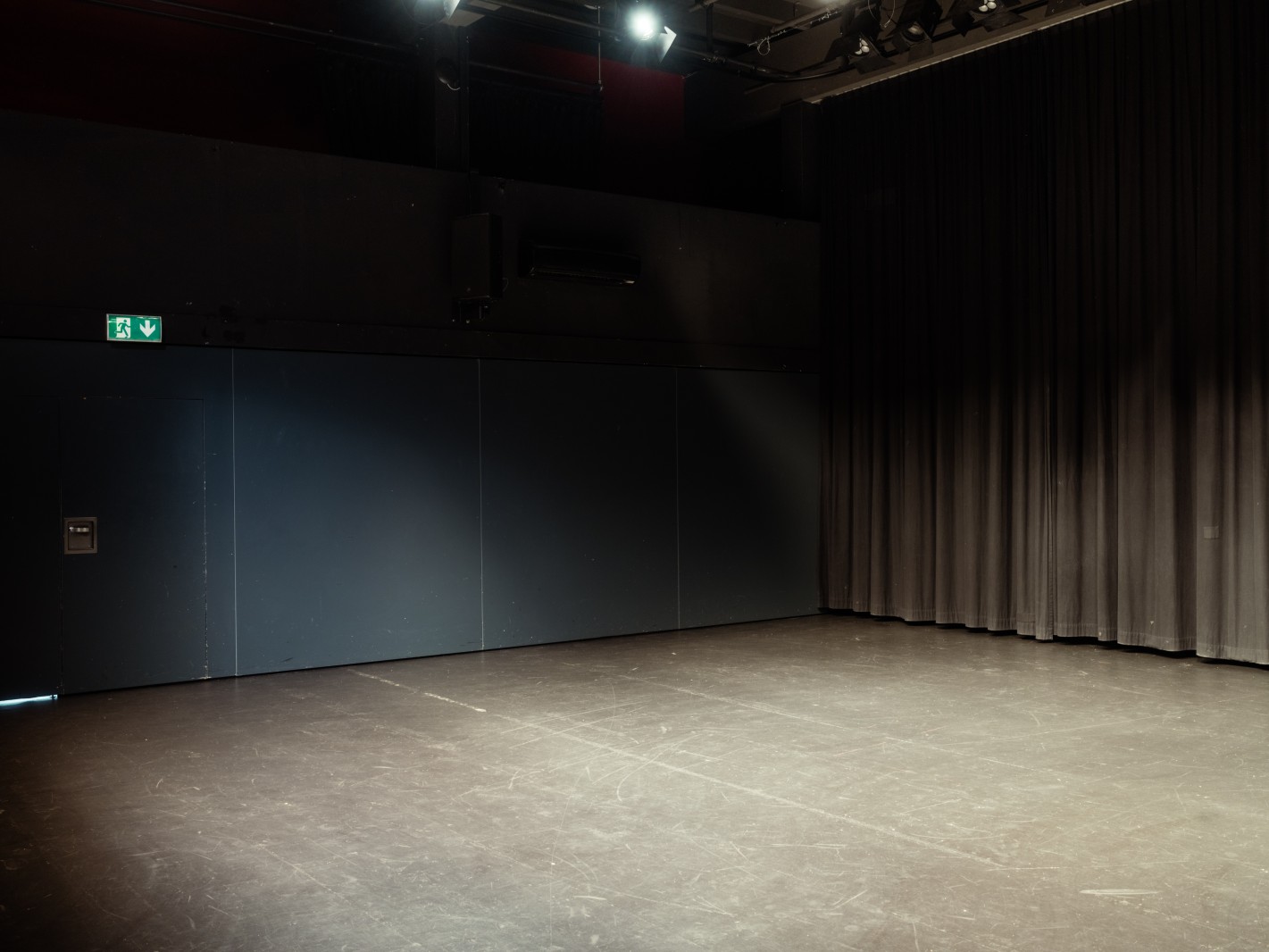 Unser Theatersaal verfügt über eine Tribüne mit 137 Sitzplätzen und eine Bühne von 8 × 11 Meter. Bühnenraum und Bühnenhinterraum sind durch einen Vorhang abgetrennt. Wird dieser entfernt, kann die Bühnentiefe um drei Meter vergrössert werden. Der Theatersaal verfügt über ein PA-System mit zwei Subwoofern und eine LED/Halogen-Lichtanlage – beides ist im Mietpreis inbegriffen. Ein hellbrauner Yamaha-Flügel (Masse: ) steht ebenfalls bereit für Dein Geklimper, professionelles Spiel oder extravagantes Gezupfe.